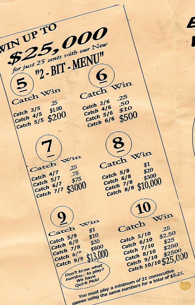Let's analyze the bet sheet. On the "2-Bit Menu" you will pay a quarter per game, which you will not get back. Let's say you choose the "5 catch win." This means that you will pick five numbers. They will pick 20. If exactly three of your five numbers are in their twenty, they pay you a quarter (i.e. you get your money back). If exactly four of your five are in their twenty, then they pay you a dollar. And if all five are your numbers are in their twenty, you win $200!!!!! Whoo-hoo!!!