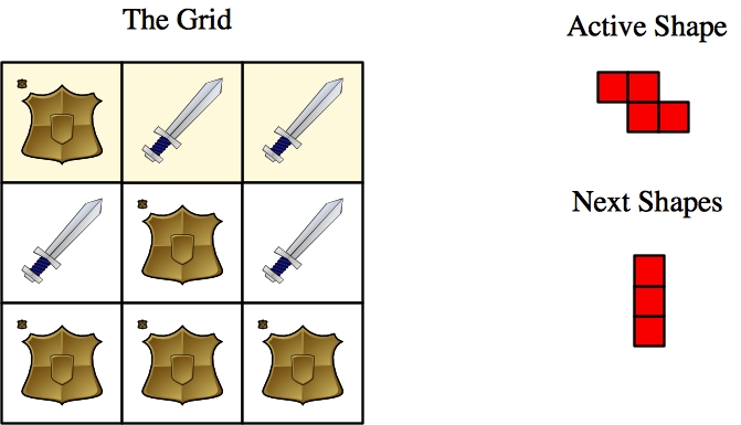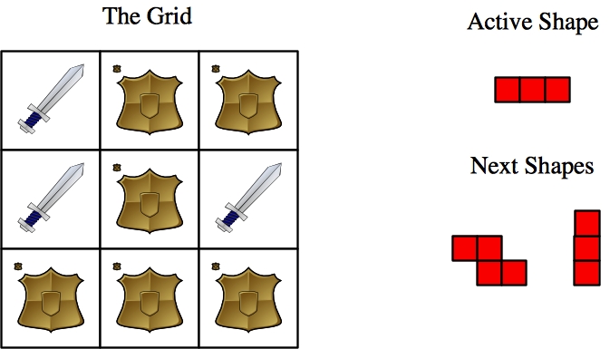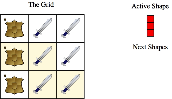 Those are the mechanics of the game. You are given a grid of swords and shields and a collection of shapes. Your goal is to apply all of the shapes to the grid so that you end up with a grid of all swords.