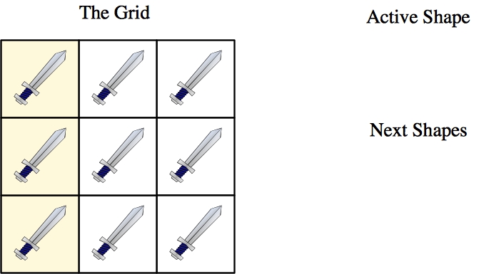 You apply the active shape to a part of the grid where it fits. For example, in the picture above, you can apply the active shape to row zero, row one or row two (life is zero-indexed, of course). When you apply the shape, all grid cells that the shape overlaps change swords to shields and vice versa. For example, suppose you apply the active shape to row zero. The state of the system then changes to: