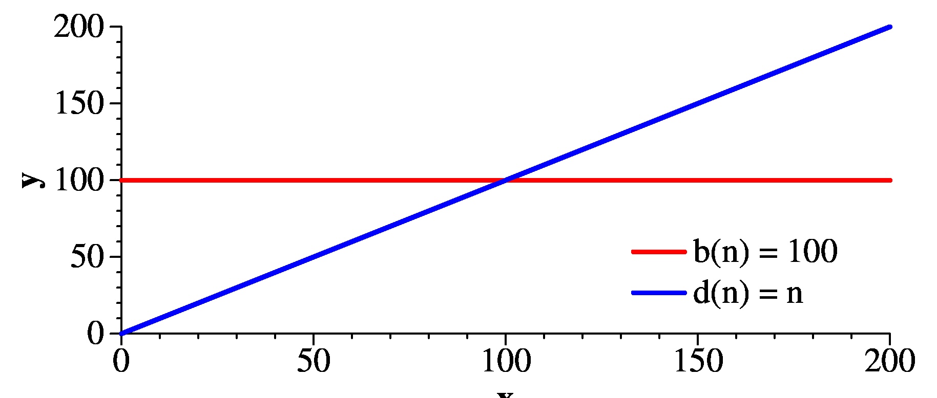 That was easy. How about d(n) and b(n)? d(n) is greater, and to demonstrate it, we need to pick a value of x0. We can't pick 0, because b(0) is 100 and d(0) is 0. However, if we pick x0 to be 101, now it works -- every value of d(n) is greater than 100 when n > 101.
