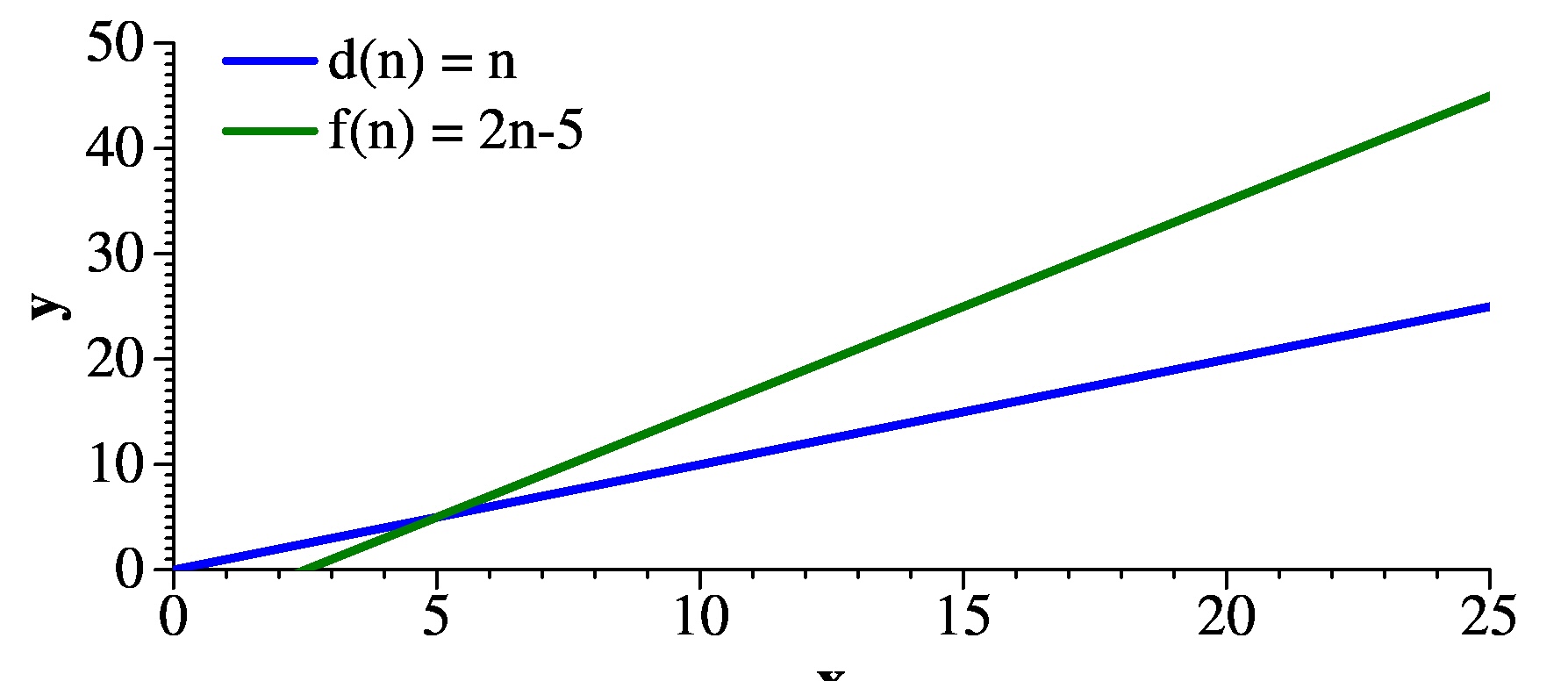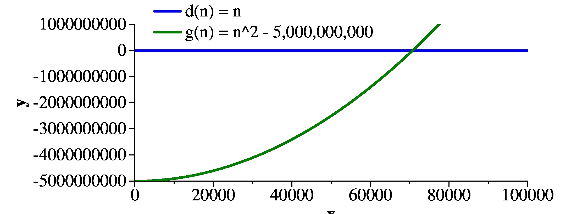 For a more drastic example, look at g(n) and d(n). For small values of n, d(n) is a lot greater. However, let's consider a large value of x0, like 100,000. d(n) = 100,000. And g(n) = 10,000,000,000 - 5,000,000,000, which is 5,000,000. That's much bigger than d(n). Plus, as n grows bigger than x0, g(n) grows more quickly than d(n). Therefore, g(n) > d(n).