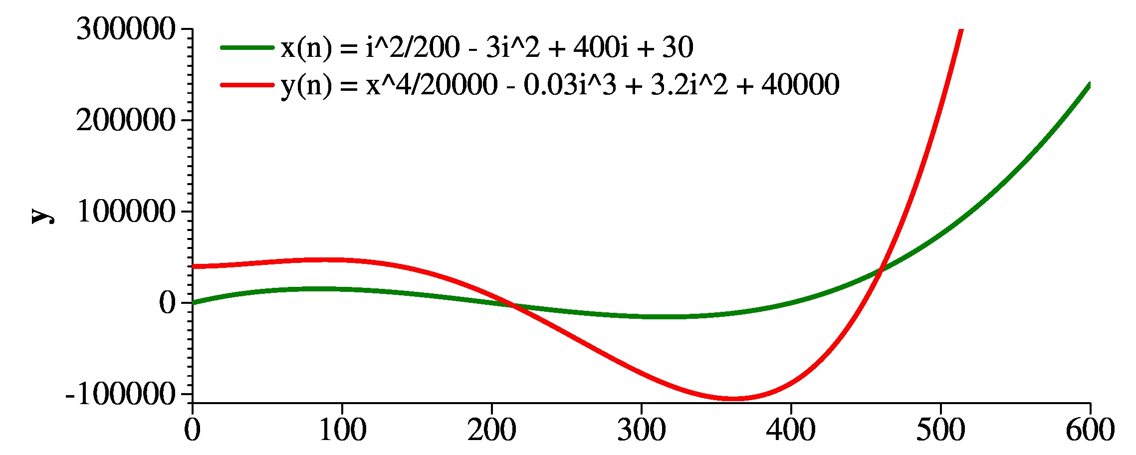 Here's a final example -- just look at the graph. y(n) is greater for x up to roughly 200. Then it dips down until x gets to roughly 475, at which point that x4 term takes over. After that, y(n) is greater than x(n), so y(n) is the greater function.