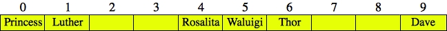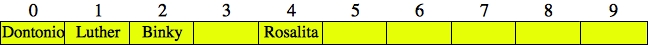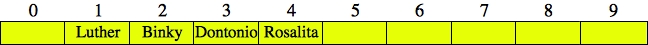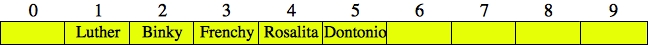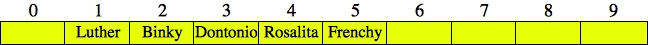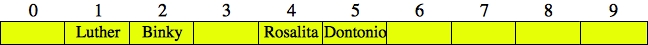 UNIX> bin/djbhash Luther 3249384281 Rosalita 2627953124 Binky 216319842 Dontonio 2797174031 Frenchy 561643892 <CNTL-D> UNIX>These are the same hash values as in the beginning of these notes, so when we insert "Luther", "Rosalita" and "Binky", they will hash to indices 1, 4 and 2 respectively, so there are no collisions. Here's the hash table: