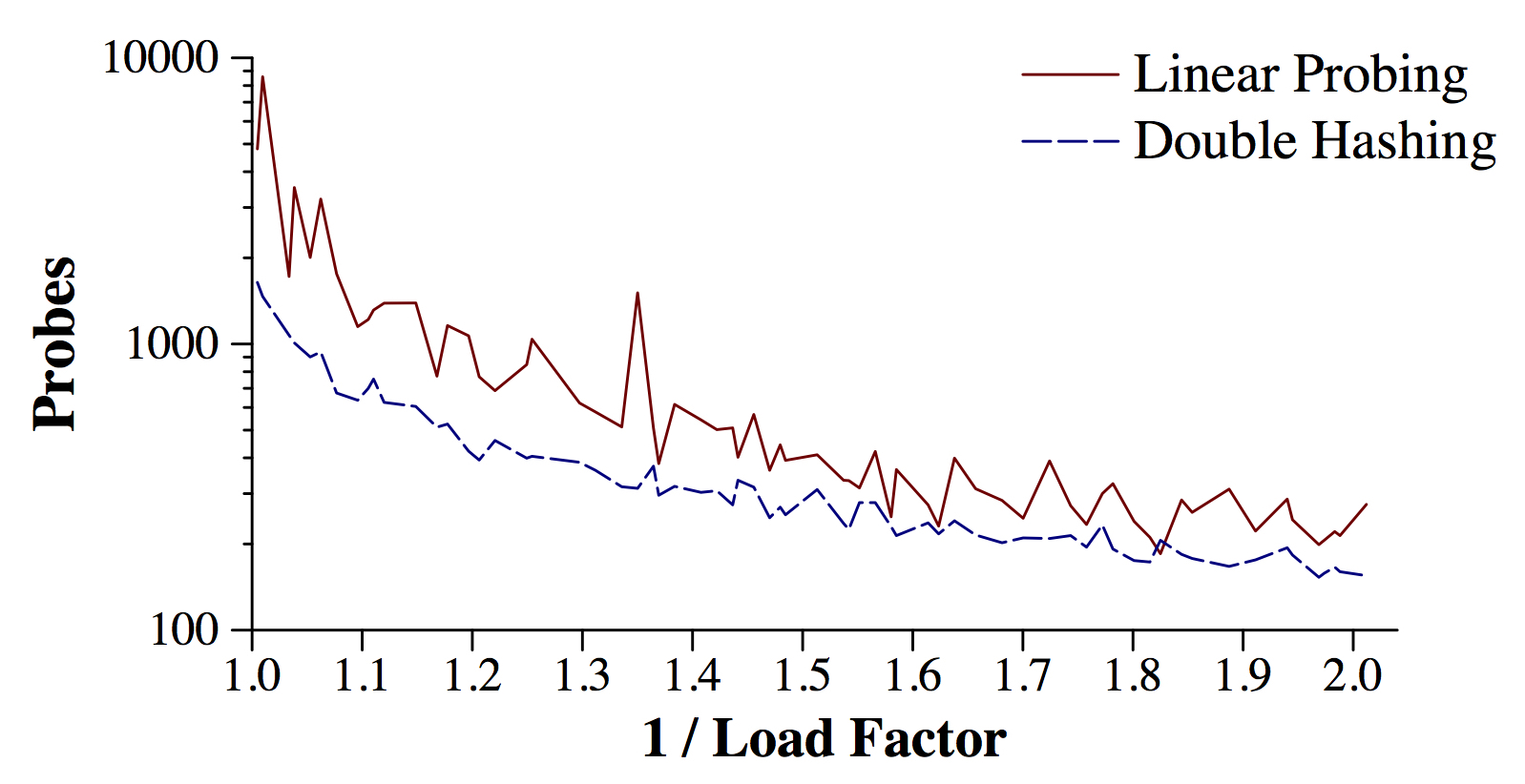 As you can see, the graph lines are not smooth, but that is because this is just one set of examples, and the exact number of probes can depend on the luck of the draw. We could smooth this by running lots of different examples, but I'm not going to do that. (Were I to write a paper on this, I'd have to do that so that my graphs are more cogent.) However, I think that the graph pretty clearly allows you to draw the conclusion that Quadratic Probing is superior to Linear Probing on this data.