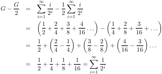 From high school math, we know that this last summation equals one, so G - G/2 = 1, which means that G = 2.