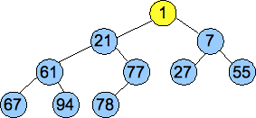 As before, an example helps. We will call Pop() on the last heap above. This will return 1 to the user, and will delete the node holding the 7, so we put the value 7 into the root and start percolating down: