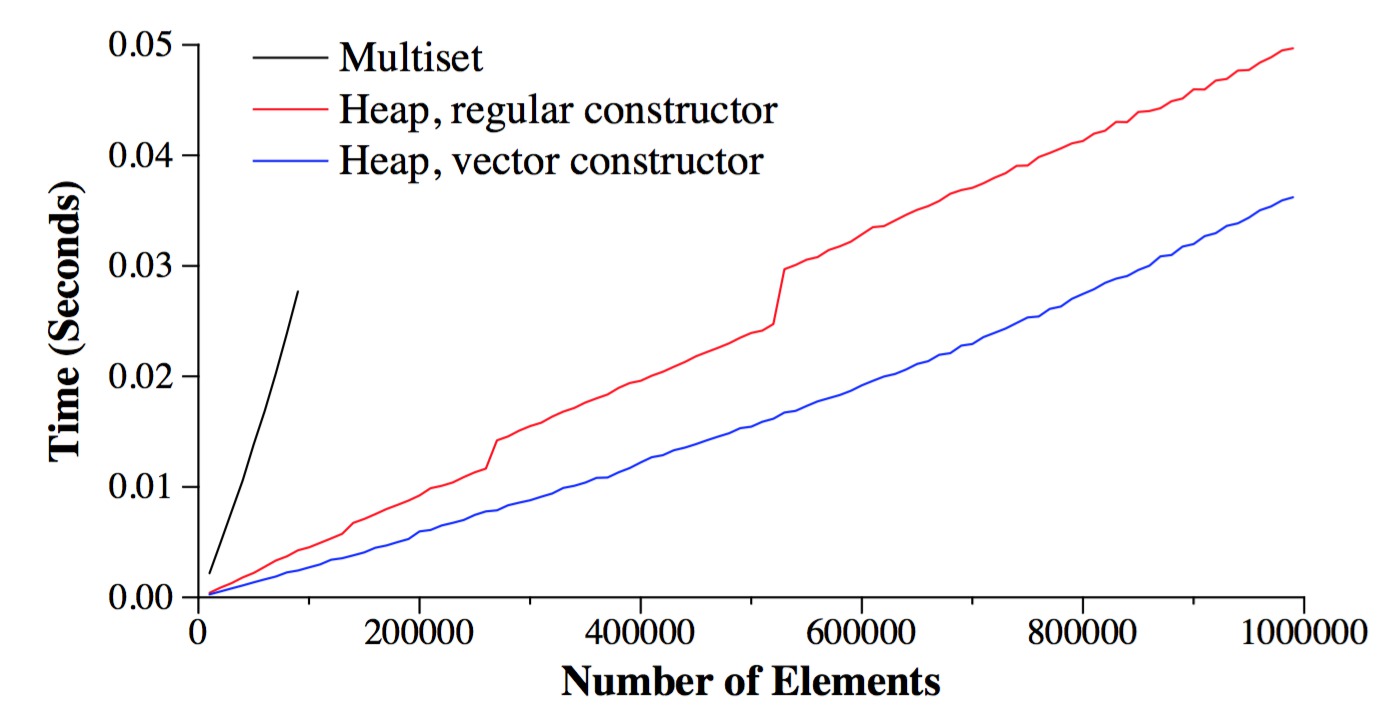 If we think about running time complexity, obviously the depth of a heap with n elements is log2(n). Thus, Push() and Pop() both run with O(log(n)) complexity. This is the exact same as using a multiset above. So why do we bother?