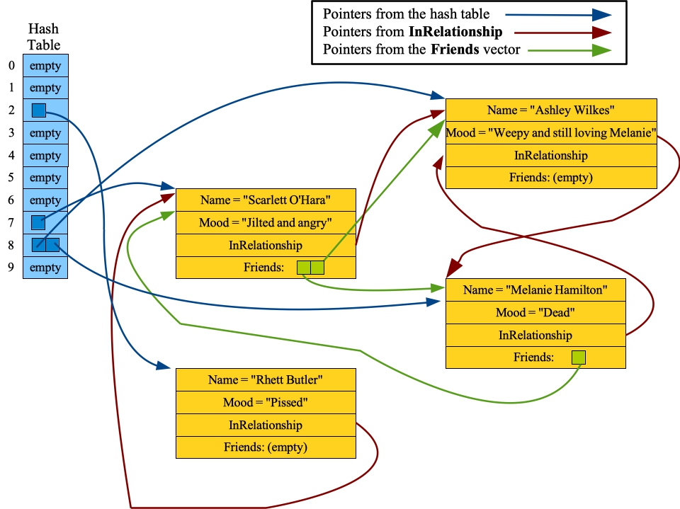 UNIX> bin/djbhash Scarlett O'Hara 1585424537 Rhett Butler 3831887322 Ashley Wilkes 2242265818 Melanie Hamilton 1839425308 <CNTL-D> UNIX>That means that "Scarlett O'Hara" goes into hash table entry 7, "Rhett Butler" goes into hash table entry 2, and both "Ashley Wilkes" and "Melanie Hamilton" go into hash table entry 8. Armed with that knowledge, take a look at the hash table, the four Person class instances, and all of their pointers. There are three places where pointers are used: