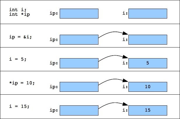 UNIX> make bin/pointer_mess_1 g++ -std=c++98 -Wall -Wextra -Iinclude -o bin/pointer_mess_1 src/pointer_mess_1.cpp UNIX> bin/pointer_mess_1 i: 5 *ip1: 5 i: 10 *ip1: 10 i: 15 *ip1: 15 UNIX>I'll try to illustrate this with pictures below. When you first declare i and ip, that allocates space for them. Setting ip to be &i has ip "point" to i. Then, when you set i or *ip, it sets the integer stored in i. For that reason, printing i or *ip prints the same value: