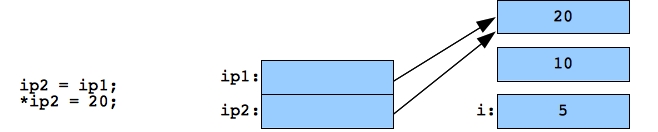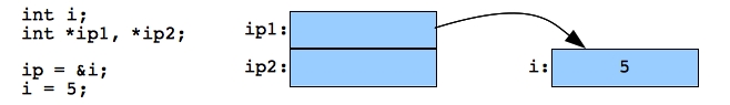 This program has two pointers, ip1 and ip2. The first statements are the same as the previous program -- ip is set to be &i and then i is set to five: