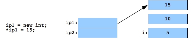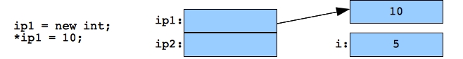 In the next set of statements, we call new. This creates a new integer and has ip1 point to it. This is called "allocating memory." This memory is guaranteed to exist until either the program ends, or you explicitly call delete on the pointer. That makes it different from local variables or procedure parameters which are created when a procedure starts running and is reclaimed when the procedure ends. Here's a picture -- you should see why the printf() statement prints out i as 5, and *ip1 as 10.