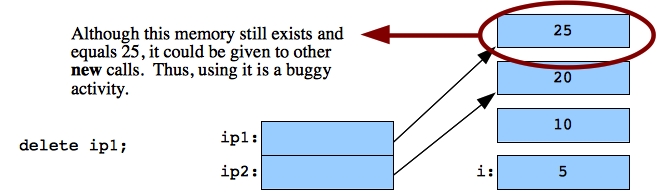 Printing out i and *ip1 yields 5 and 15. However, you'll note that the integer that holds 10 has nothing pointing to it. This is called a memory leak, because that memory will not be deallocated until the program ends, and no part of the program can access it. Memory leaks are things that you want to avoid, especially when you're writing programs that will run for a long time (like a web browser or editor).
