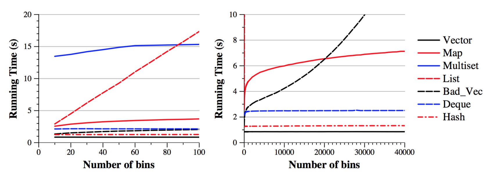 Question: Why is the bad_vec curve better than the list's curve, when O(n*bins) is faster than O(bins2)? (remember, we're holding n constant? Because the list implementation is performing O(bins) for every Add_Value() call, due to its linear lookup of the value. The bad_vec implementation performs O(log(bins)) for every Add_Value() call, because it uses binary search to find the value, and only does an O(bins) operation when it has to insert a new value. When bins is 40,000, the ratio of insertions to finds is 40,000/10,000,000, or 0.004. This is why the bad_vec implementation is faster than the list implementation -- it does the slow operation very infrequently, while the list operation does it at every Add_Value() call.