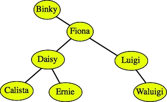 For example, suppose that we want to insert Calista into the above tree. We try to find the string as we did above. We fail at Daisy's left child, which doesn't exist. Therefore, we create a node for Calista and insert it as Daisy's left child: