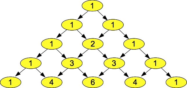 Scanning for a pattern, let's consider the j-th element in row i. If it is the first or last element in the row, it will equal one. Otherwise, you can see from the picture that it is equal to the sum of elements j-1 and j in row i-1. That gives us a nice way to construct the triangle. The code is in src/pascal.cpp: