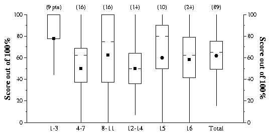 - The box goes from the first quartile (i.e. 25% of the scores are