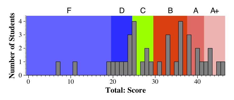 The ranges of grades are below. I am not breaking up grades into "B+" or "A-". Instead, I simply break them up into ABCD, and use those scores to calculate your final scores. When I get the final scores, I will break up the B's into A-/B+/B, and the C's into B-/C+/C.