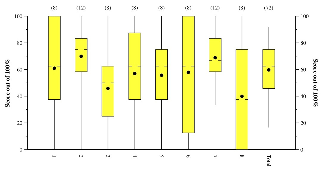 The hash marks denote the median. The dot denotes the mean.