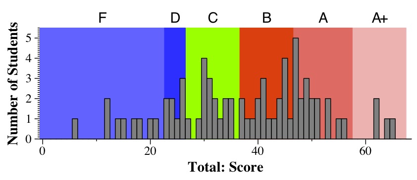 Please see My final grading guide for CS302 for description of how the midterm affects the final grade. In particular, with this midterm, I will consider the top grade to be 58 (so those four students will have more than 100% on the exam).