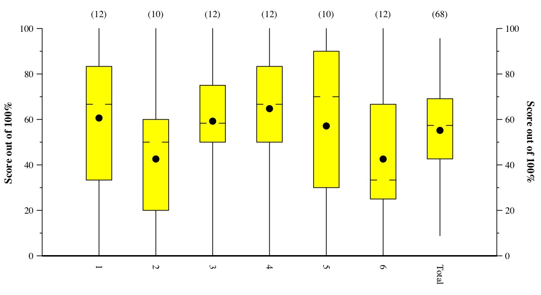 Here's my view of letter grades for this test. The A student, in my opinion, would get the following scores for each question: 9, 8, 9, 9, 7, 5. That's where I set the A mark. The rest of the letter grades are as follows: