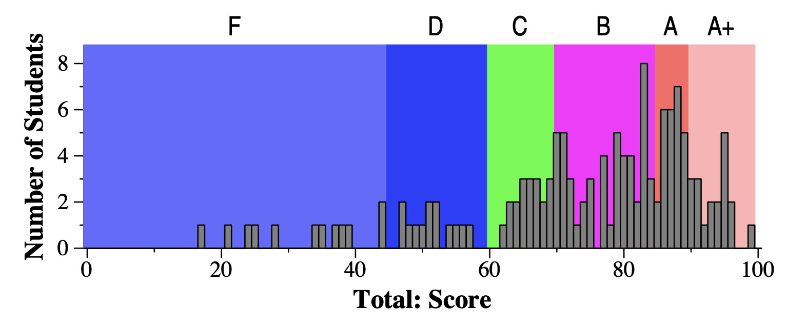 Here is the mapping of scores to letter grades. I don't put plusses and minuses on