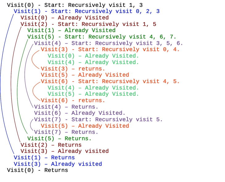 A recursive visiting of all nodes using DFS starting with node zero will look as follows: