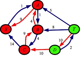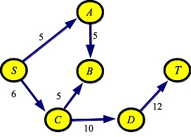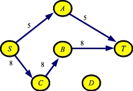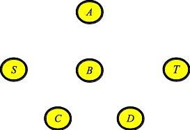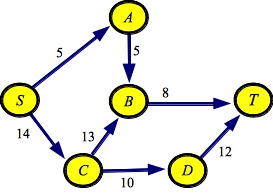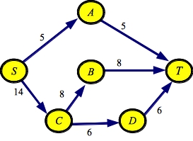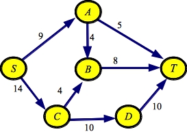 Here's an example graph, with source S and sink T (in this and other pictures, you can click on the pictures, and get the full size picture):