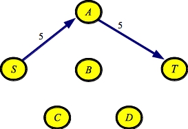 You'll recall that this is the point at which we were stuck above. However, the reverse edges have now given us another path through the graph: S-A-B-C-D-T, with a flow of four. Let's process those:
