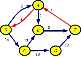 Like before, we start with the path S-A-T. It has a flow of 5. So, we'll add that path to the flow graph, subtract the flow from S-A-T, and also add ``reverse'' flow along the path T-A-S. Here is the result. I'm drawing the ``reverse'' flow in red, since this flow is usually the one that confuses students.