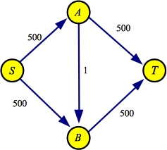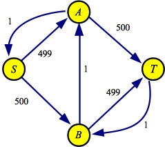 It's pretty easy to eyeball this graph and see that it has a maximum flow of 1000. The two paths are S->A->T and S->B->T. However, if you try to determine the maximum flow using augmenting paths, and you choose the wrong path at each step, it will take 1000 iterations of the algorithm. To illustrate, suppose that the first path you choose is S->A->B->T with a flow of one. When you process this path through the residual graph, you end up with the following: