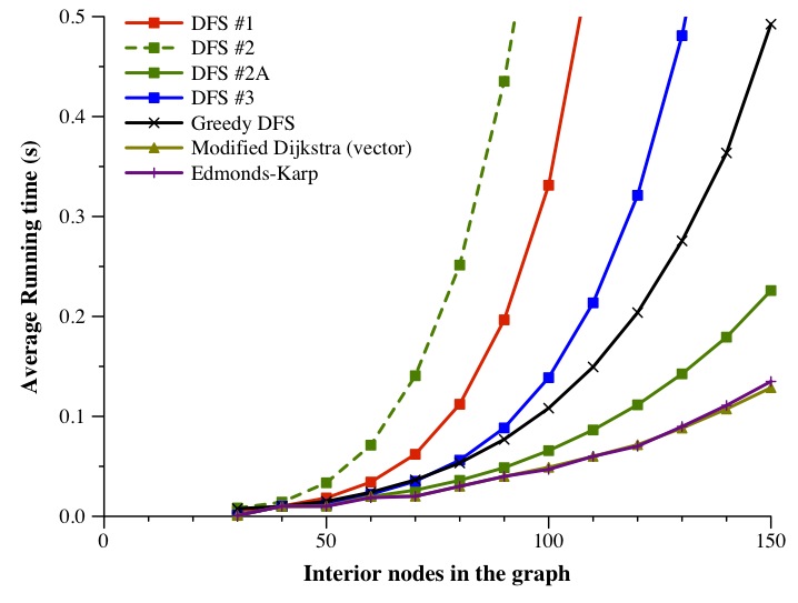 The conclusion here is pretty clear -- for graphs of this type, Modified Dijkstra and Edmonds-Karp are clearly the best algorithms to use. I'm pretty impressed, though, at how well DFS #2A performs, given how simple it is.