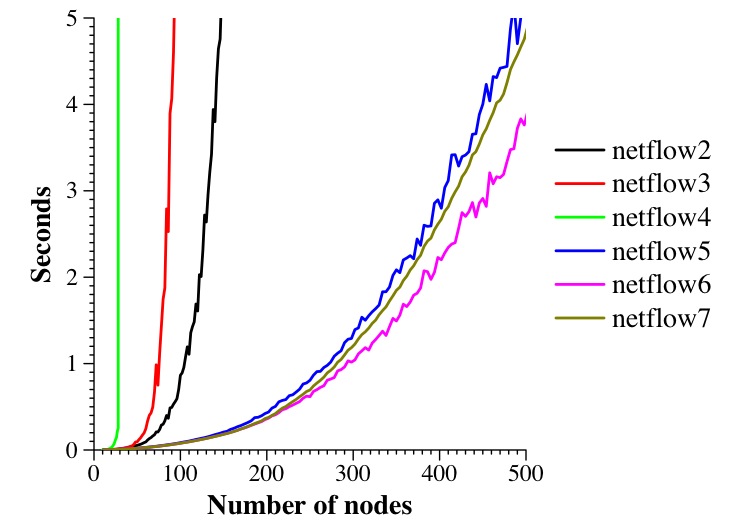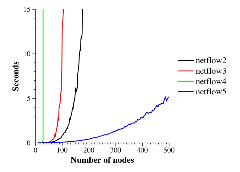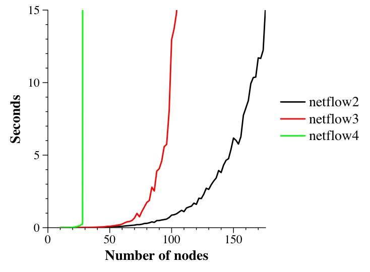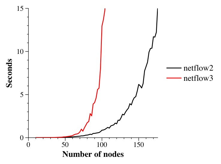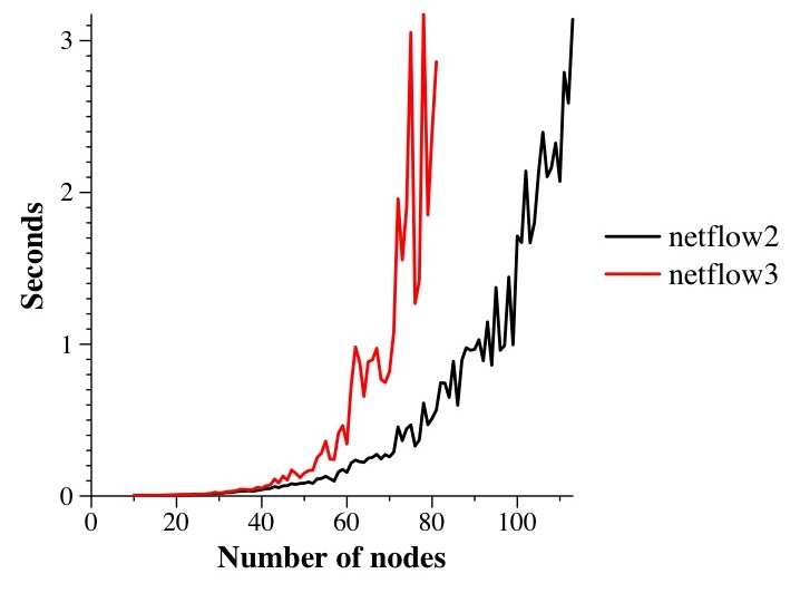 Although both graphs clearly show that netflow2 outperforms netflow3, the second is much better, and worth the extra time to produce (think about it -- 50 iterations of 10 seconds is a little over eight minutes for a single data point).