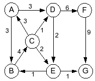 SOURCE A SINK G EDGE A D 3 EDGE A B 3 EDGE B C 4 EDGE C A 3 EDGE C D 1 EDGE C E 2 EDGE D E 2 EDGE D F 6 EDGE E B 1 EDGE E G 1 EDGE F G 9 |