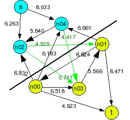 UNIX> netflow6-cut < g3.txt Flow is 10.087 Cut Edges: [n02->n03:0.741] [n02->n01:4.929] [n04->n03:4.417] Cut Capacity: 10.087 UNIX>Pictorally: