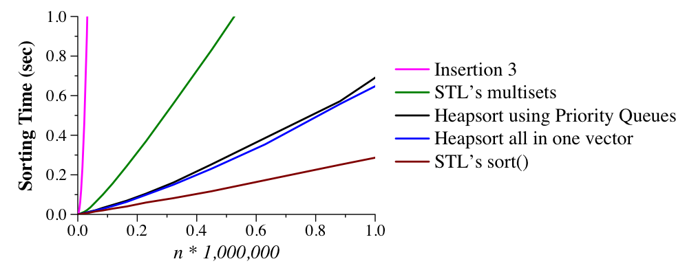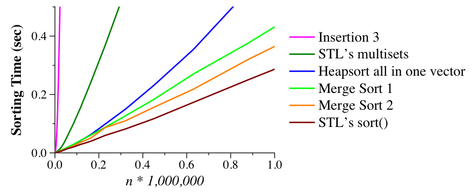 As it turns out, this process is quite slow, and the reason is that as v2 fills up, it takes longer to find empty slots and they are quite far from where they should be. We fix this in src/bucket_2_sort.cpp where we double the size of v2 so that there are more empty cells and a much smaller chance of having to move to adjacent cells. As you can see, the results are great -- even better than the Standard Template Library!