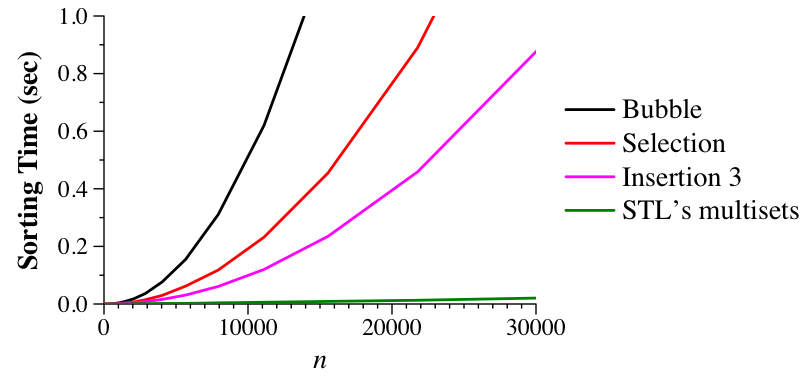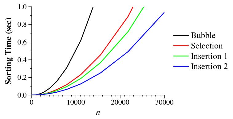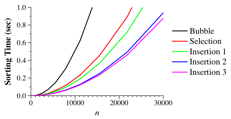 What makes insertion sort different than selection and bubble sort is that the number of operations that insertion sort takes in each inner loop is dependent on the element to be "inserted," and how many elements have to move to accomodate it. In the worst case, that element will go to the beginning of the vector, which will make insertion sort's running time be just like selection and bubble sort. In the "average" case, the element will have to go into the middle of the elements that precede it, which is still O(n2). But what makes insertion sort interesting is what happens when the element to be inserted is close to where it belongs. Then, insertion sort is much faster.