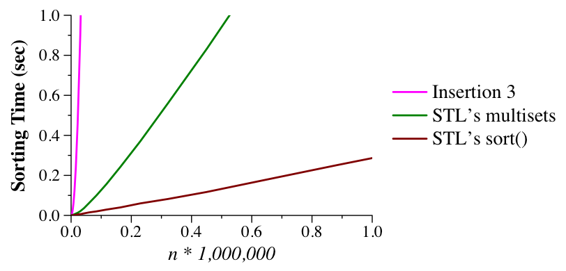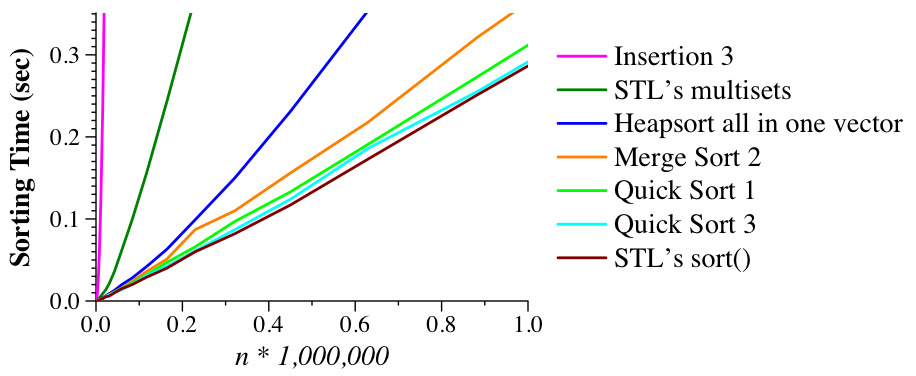 UNIX> time bin/quick_1_sorted 100000 1 0 no no 5.173u 0.012s 0:05.21 99.4% 0+0k 0+0io 0pf+0w UNIX> time bin/quick_2_sorted 100000 1 0 no no 0.006u 0.003s 0:00.01 0.0% 0+0k 0+0io 0pf+0w UNIX>Quicksort #3 sorts lists of size 46 and smaller with insertion sort. That improves the performance a little: