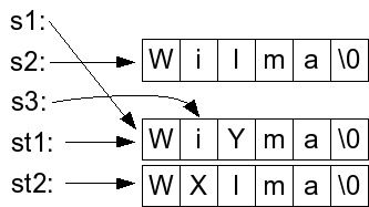Now, the line "st1 = s2" makes a copy of "Wilma", and the line "st2 = st1" makes another copy of "Wilma". The next two lines set individual characters of each of these copies. Here's the state of the variables: