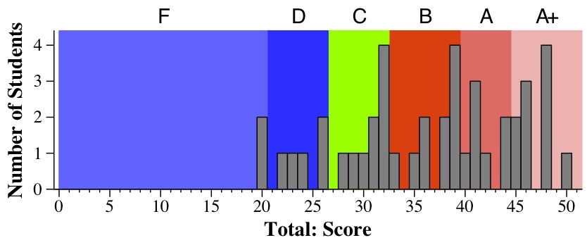 The ranges of grades are below. I am not breaking up grades into "B+" or "A-". Instead, I simply break them up into ABCD, and use those scores to calculate your final scores. When I get the final scores, I will break up the B's into A-/B+/B, and the C's into B-/C+/C.
