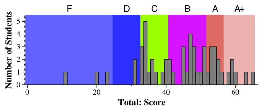 The ranges of grades are below. I am not breaking up grades into "B+" or "A-". Instead, I simply break them up into ABCD, and use those scores to calculate your final scores. When I get the overall class scores, I will break up the B's into A-/B+/B, and the C's into B-/C+/C.