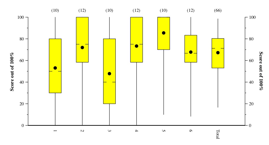 In the answers and grading, there are histograms of scores for each question, and a grid of the answers given for Question 3.