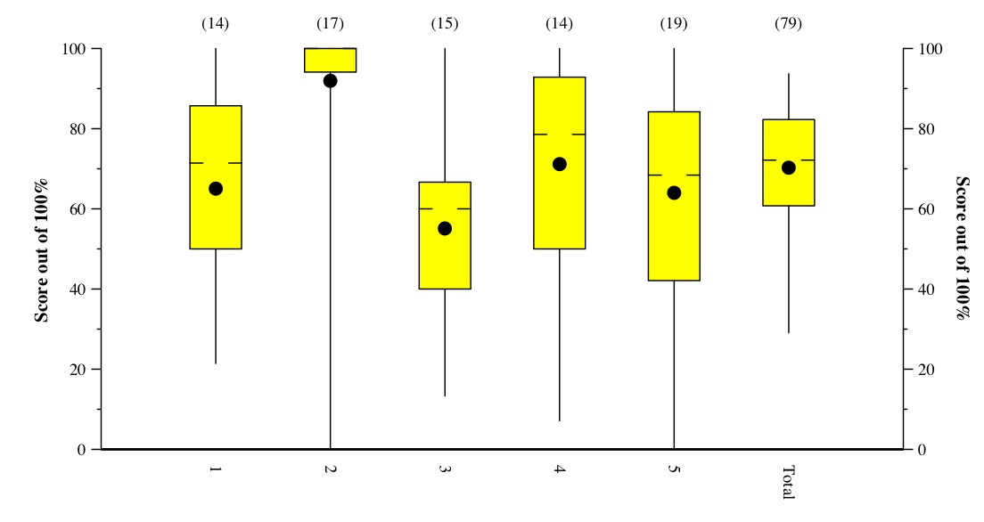 In the answers and grading, there are histograms of scores for each question, and a grid of the answers given for Questions 1 and 3.