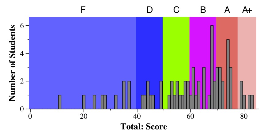 The ranges of grades are below. I am not breaking up grades into "B+" or "A-". Instead, I simply break them up into ABCD, and use those scores to calculate your final scores. When I get the overall class scores, I will break up the B's into A-/B+/B, and the C's into B-/C+/C.