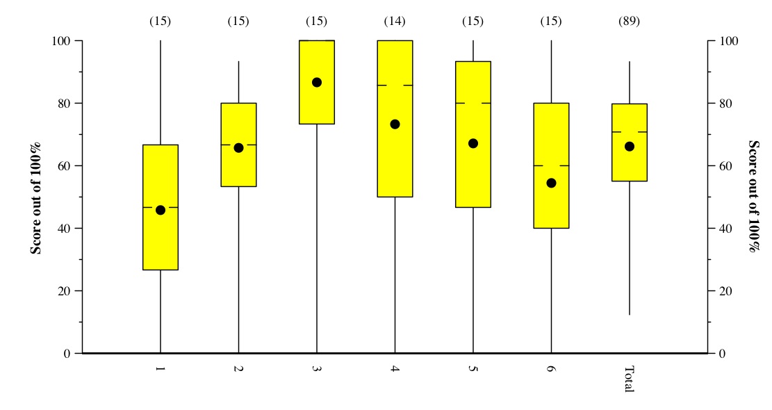In the answers and grading, there are histograms of scores for each question, and a grid of the answers given for Questions 1 and 3.