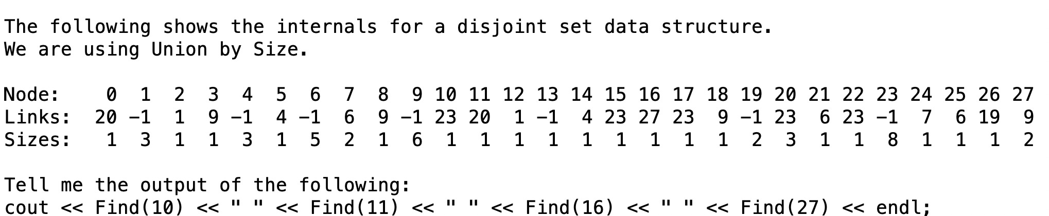 A lot of the points in grading this question came from your choice of a data structure. If you simply had a map whose key was an integer and whose val was a string, you lost roughly 8 points, because you lose names when you insert duplicate ages into the map. You lost more points if you chose to store things in a vector, and then to have O(n2) code to traverse the vector and print things out.