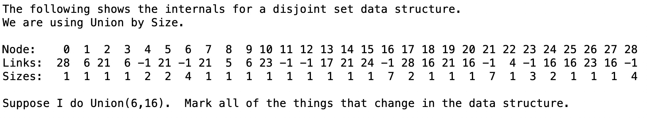 The answer here is that links[6] is set to 16, and that sizes[16] is set to 11.