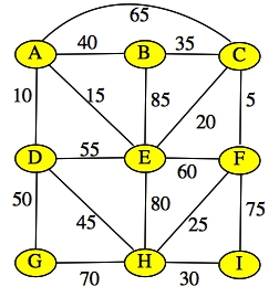 Question 5: Dijkstra, Prim & KruskalAll of the questions pertain to the graph on the right. In case you're wondering, there are 17 edges with weights that are multiples of 5, from 5 up to 85, inclusive.Part 1: Suppose you are using Dijkstra's algorithm to determine the shortest path from A to I. Tell me the order in which the nodes are visited, and tell me the shortest path. Part 2: Suppose you are using Prim's algorithm to determine the minimum spanning tree of the graph. Suppose you start with node G. Tell me order in which the nodes are visited. Part 3: Suppose you are using Kruskal's algorithm to determine the minimum spanning tree of the graph. Tell me the edges of the minimum spanning tree in the order in which Kruskal's algorithm determines them. |