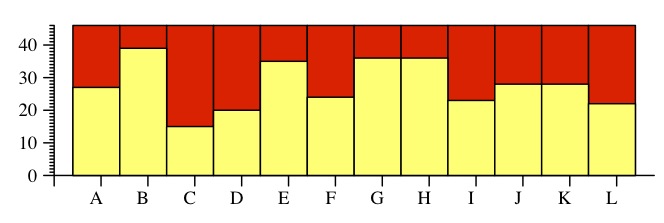 Here are the individual answers -- red is wrong, yellow is right: