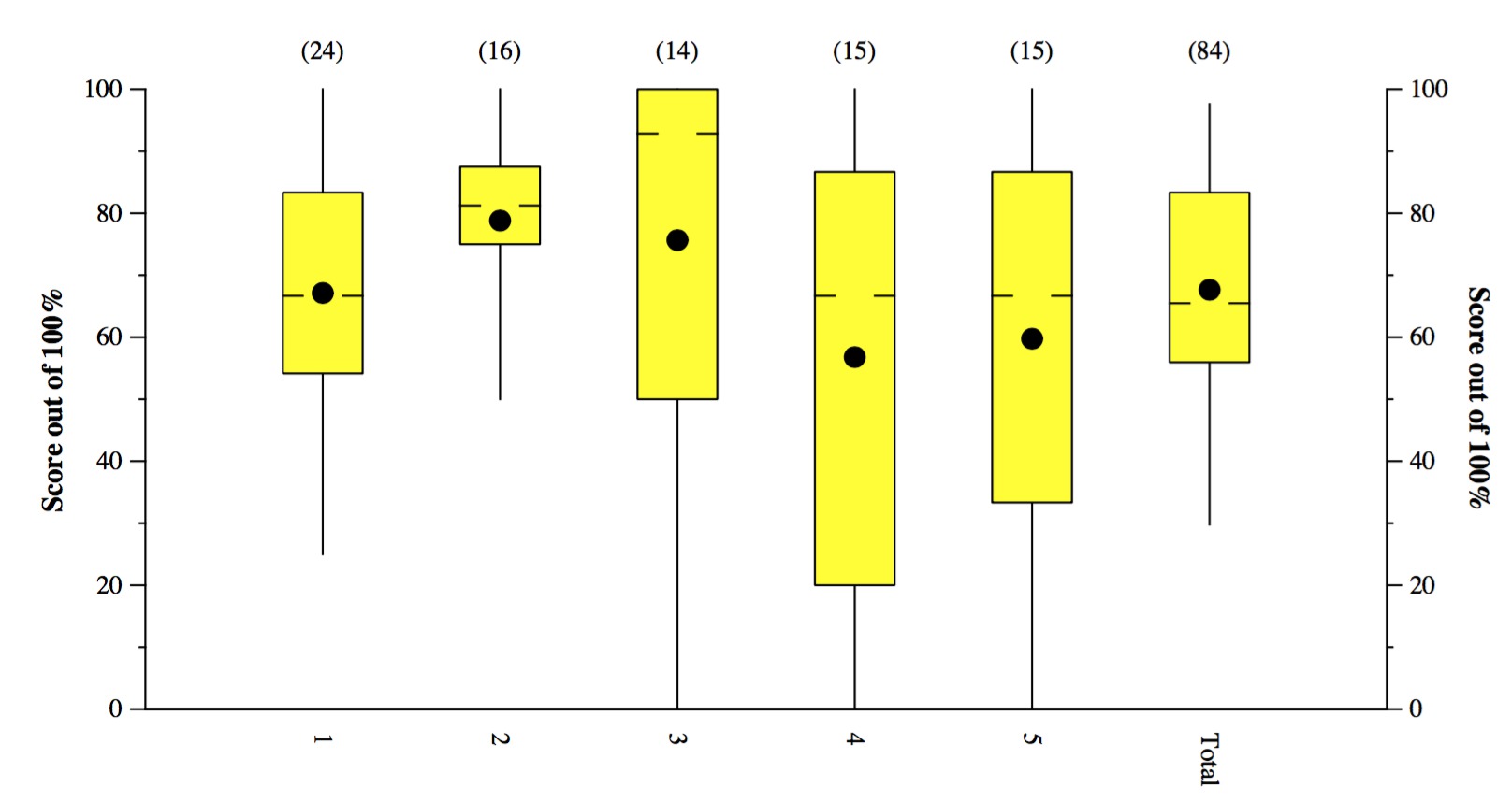 This is a Tukey Plot, which has lines to the max and min, yellow box denoting the 1st and 3rd quartiles, hash marks at the median, and dot at the mean.