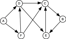 Action Incident Edges: A B C D E F ---------------------------------------------------------------------- Start 0 1 3 2 1 1 Print A and decrement incident edges for D and F - 1 3 1 1 0 Print F and decrement incident edges for C and D - 1 2 0 1 - Print D and decrement incident edges for C and E - 1 1 - 0 - Print E and decrement incident edges for C - 1 0 - - - Print C and decrement incident edges for B - 0 - - - - Print B - - - - - -The answer is: A, F, D, E, C, B.